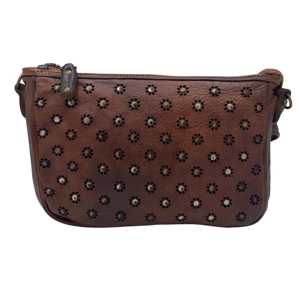 La Bayside BS691 Margherita è una borsa a tracolla che unisce lo stile vintage alla ricercatezza dei dettagli. Realizzata in pelle di vitello lavata e tinta in capo, è impreziosita da una raffinata lavorazione laserata e da borchie decorative, che creano un design grintoso e allo stesso tempo elegante.