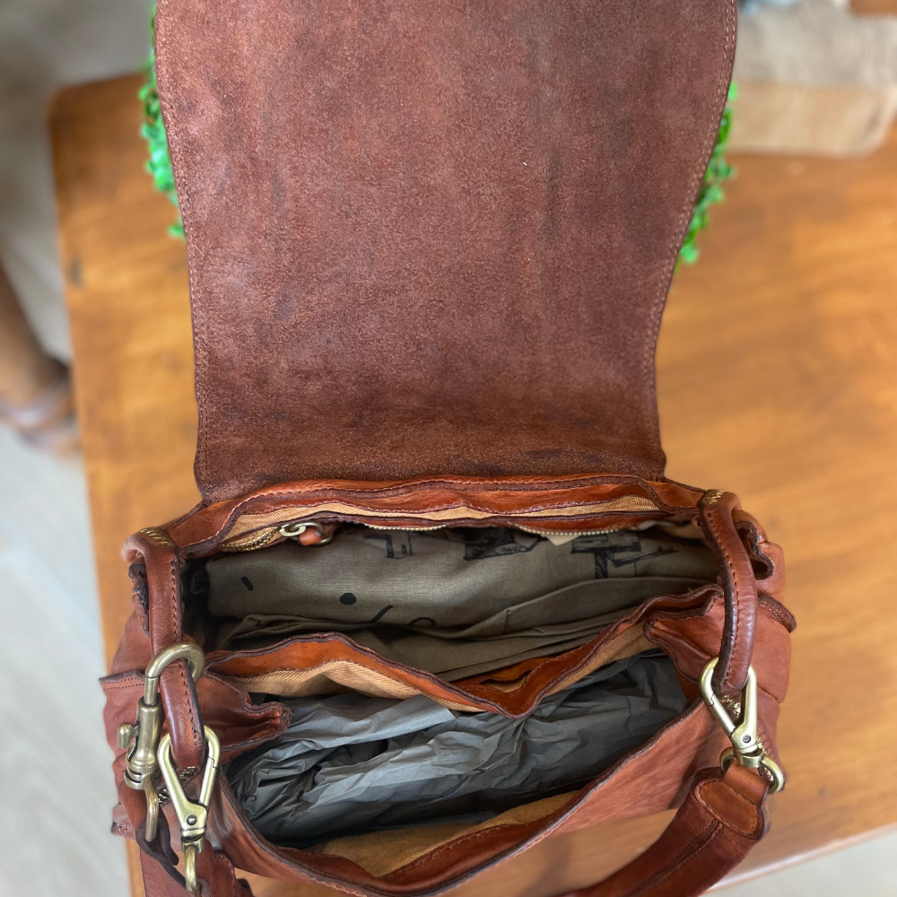Il design pratico e versatile è arricchito da numerosi dettagli funzionali: un scomparto dedicato per il cellulare, una tasca interna con zip per custodire in sicurezza gli oggetti di valore e pratici divisori interni che consentono di mantenere tutto perfettamente organizzato. La chiusura con patta assicura facilità d’uso e un tocco di eleganza artigianale.