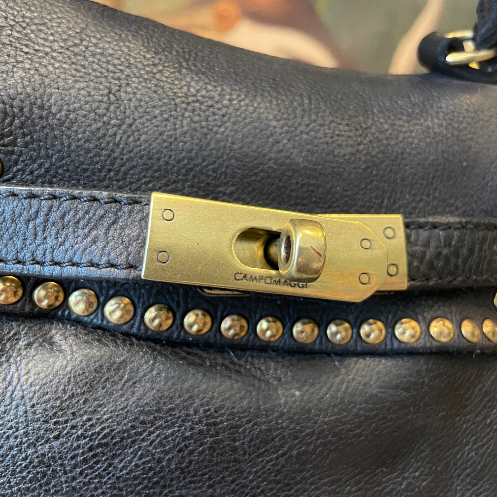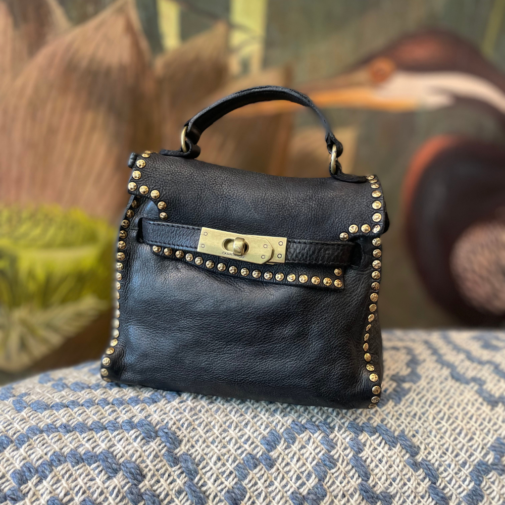 Il profilo impreziosito da rivetti metallici, applicati a mano, conferisce carattere e personalità alla borsa, creando un equilibrio perfetto tra eleganza e spirito contemporaneo. Il colore nero ne esalta la versatilità, rendendola adatta a qualsiasi occasione, dal quotidiano alle uscite serali.