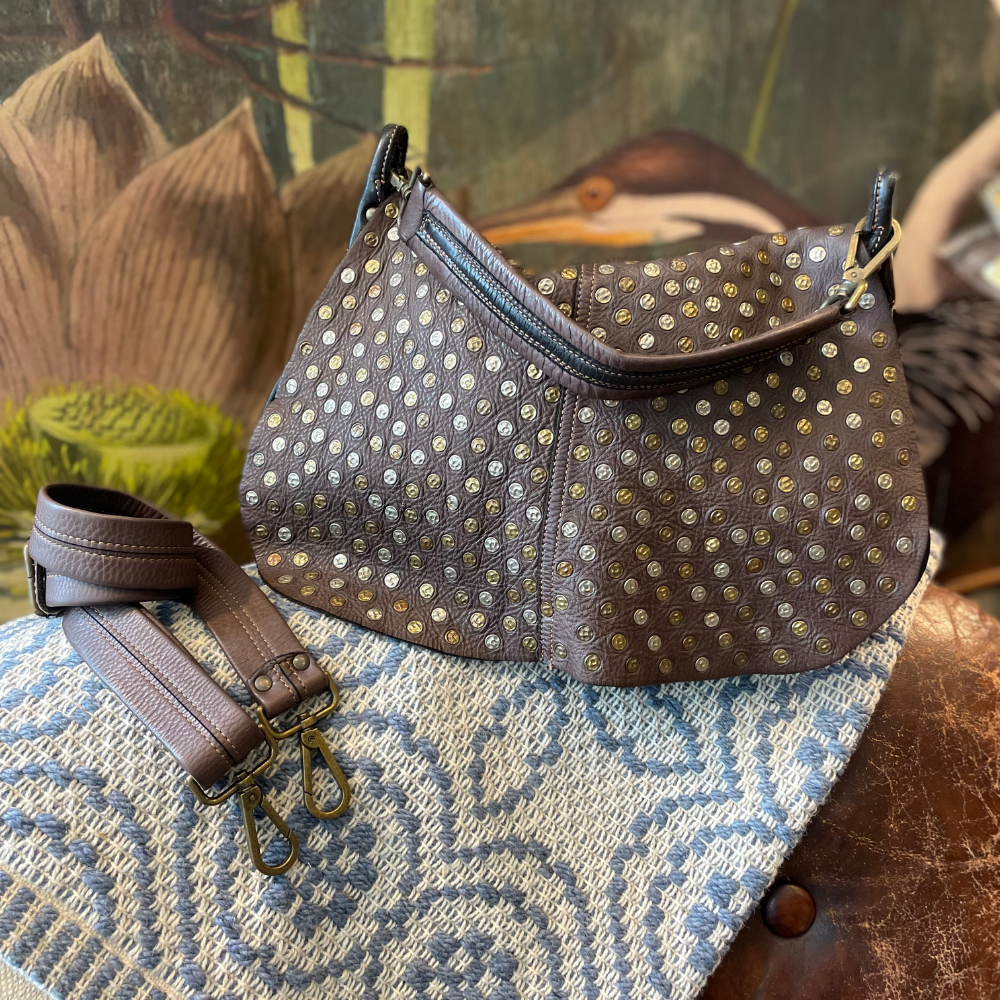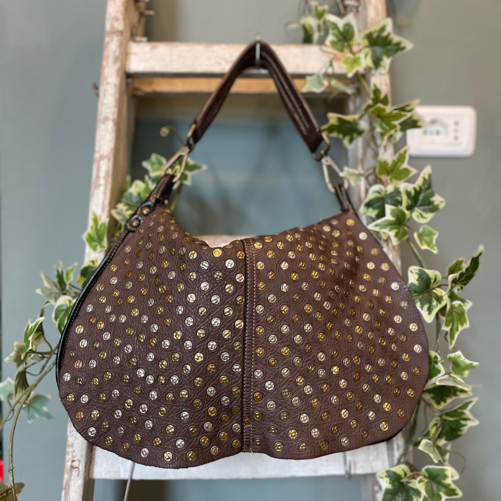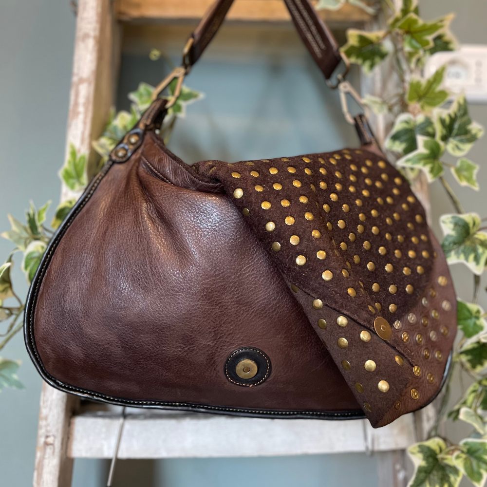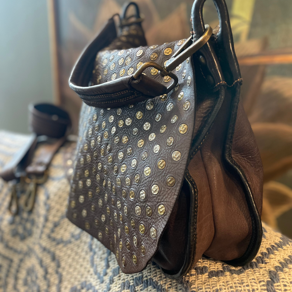 La patta interamente borchiata è l’elemento distintivo del modello: un dettaglio di grande carattere che valorizza il design e richiama l’estetica grintosa e senza tempo di Bayside. Il colore testa di moro, profondo ed elegante, esalta la texture naturale della pelle e la rende facilmente abbinabile a qualsiasi outfit.