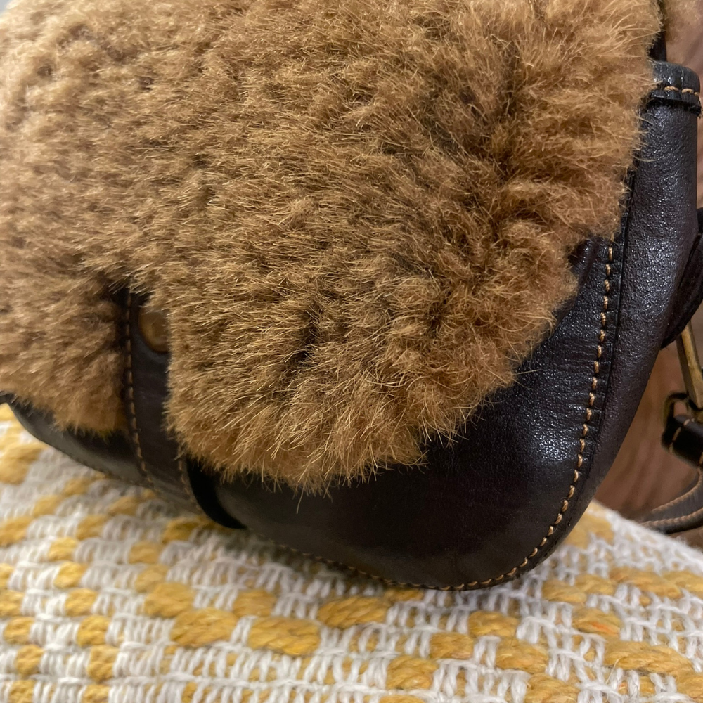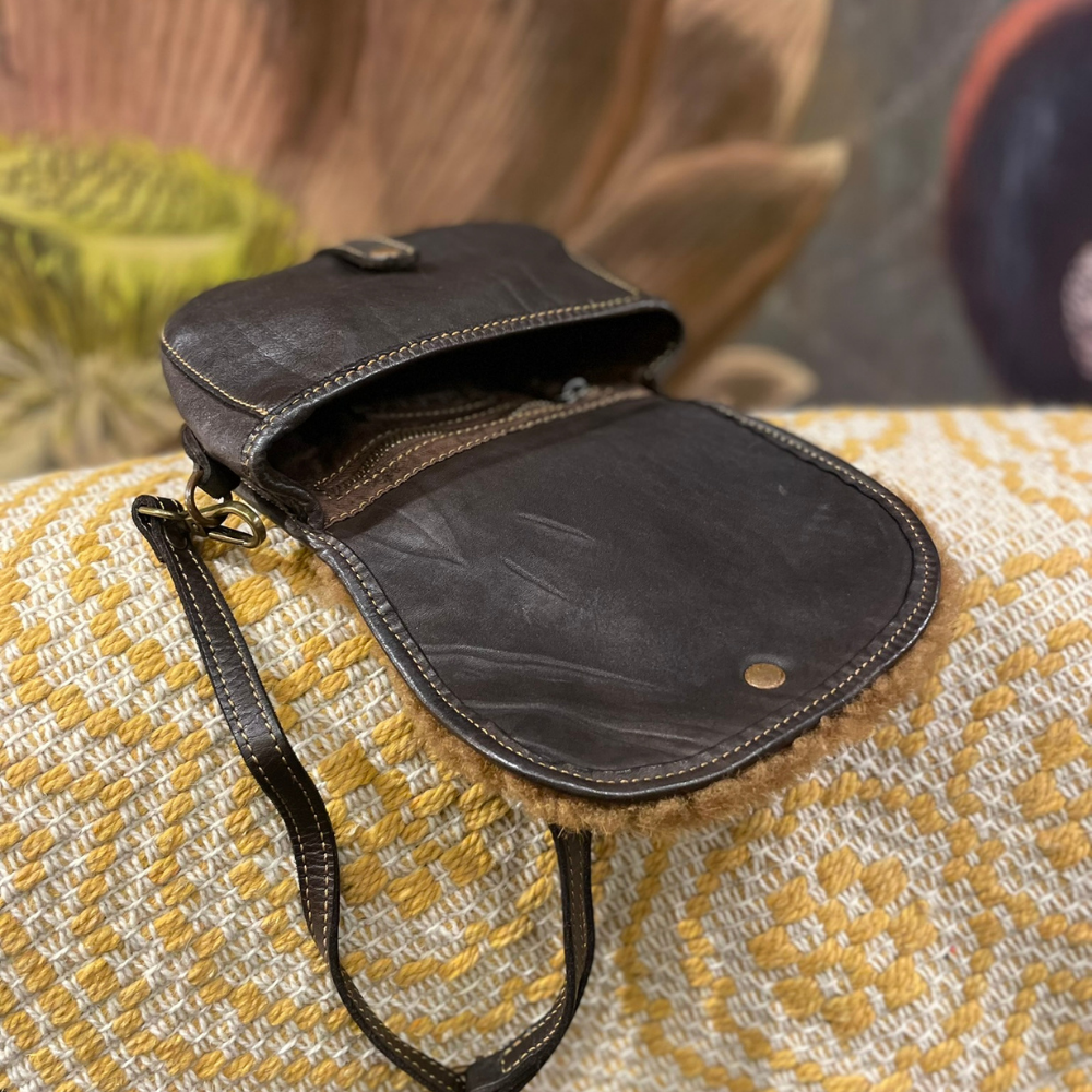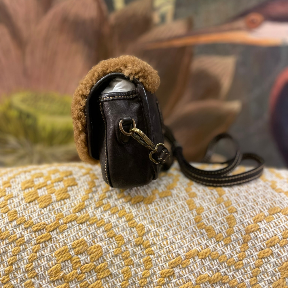 L’elemento caratterizzante del modello è la patta in montone, che aggiunge contrasto, calore e una forte identità estetica, richiamando uno stile autentico e naturale. Il colore testa di moro, profondo e intenso, valorizza sia la texture della pelle sia il dettaglio in montone, rendendo la borsa elegante ma al tempo stesso informale.