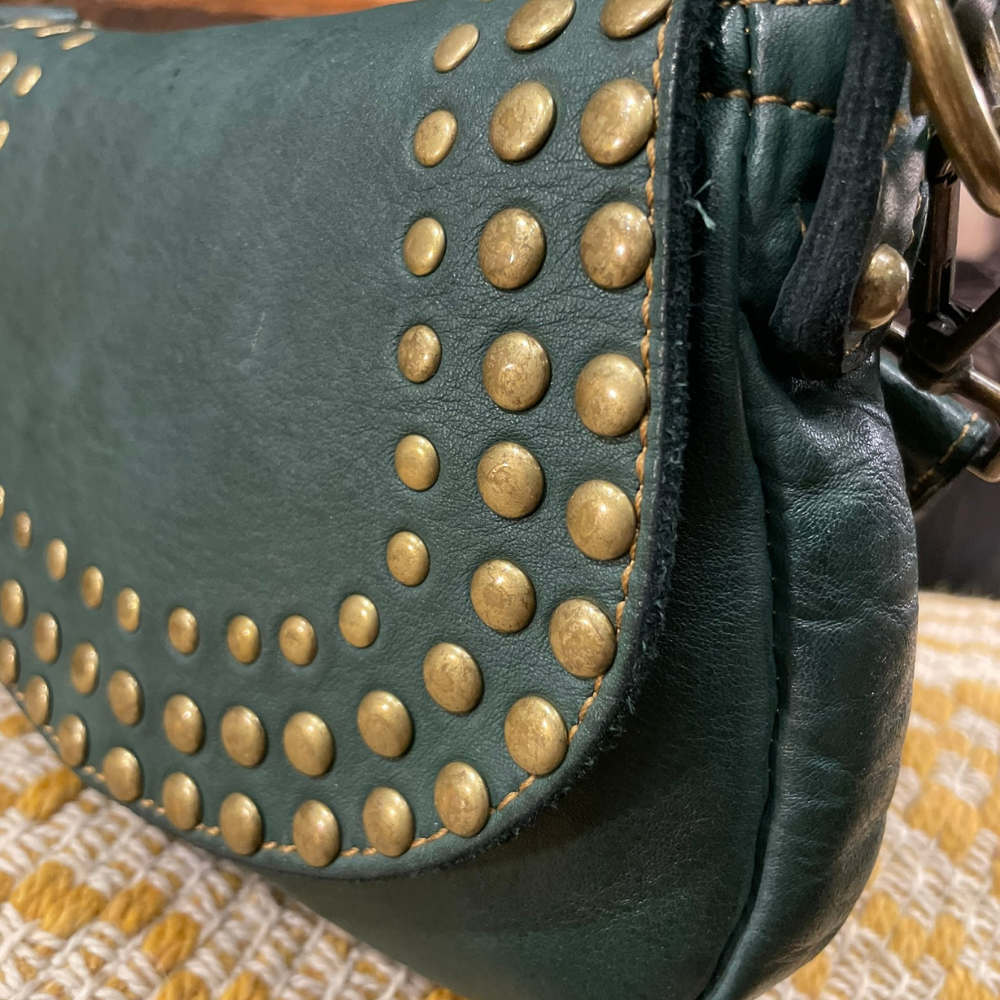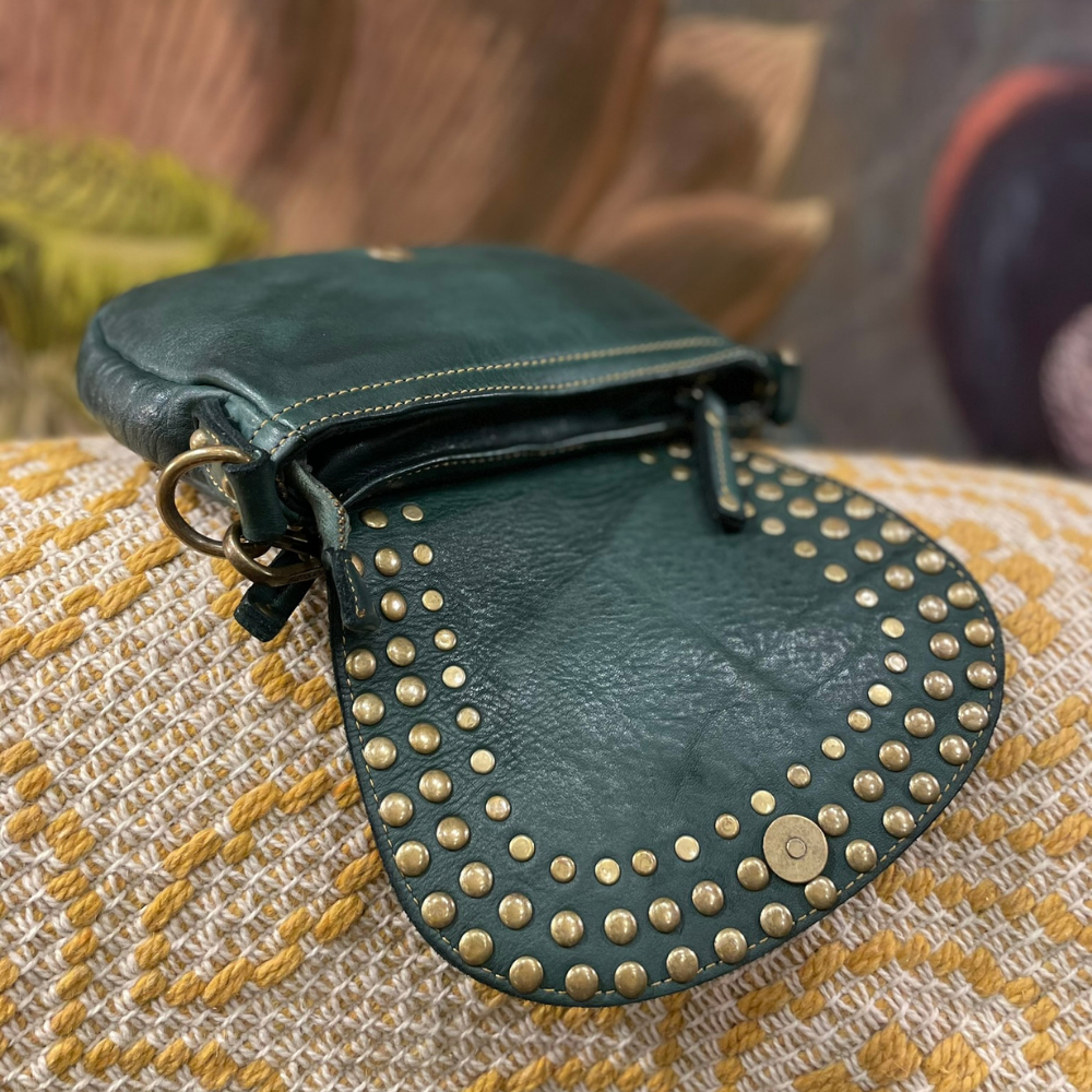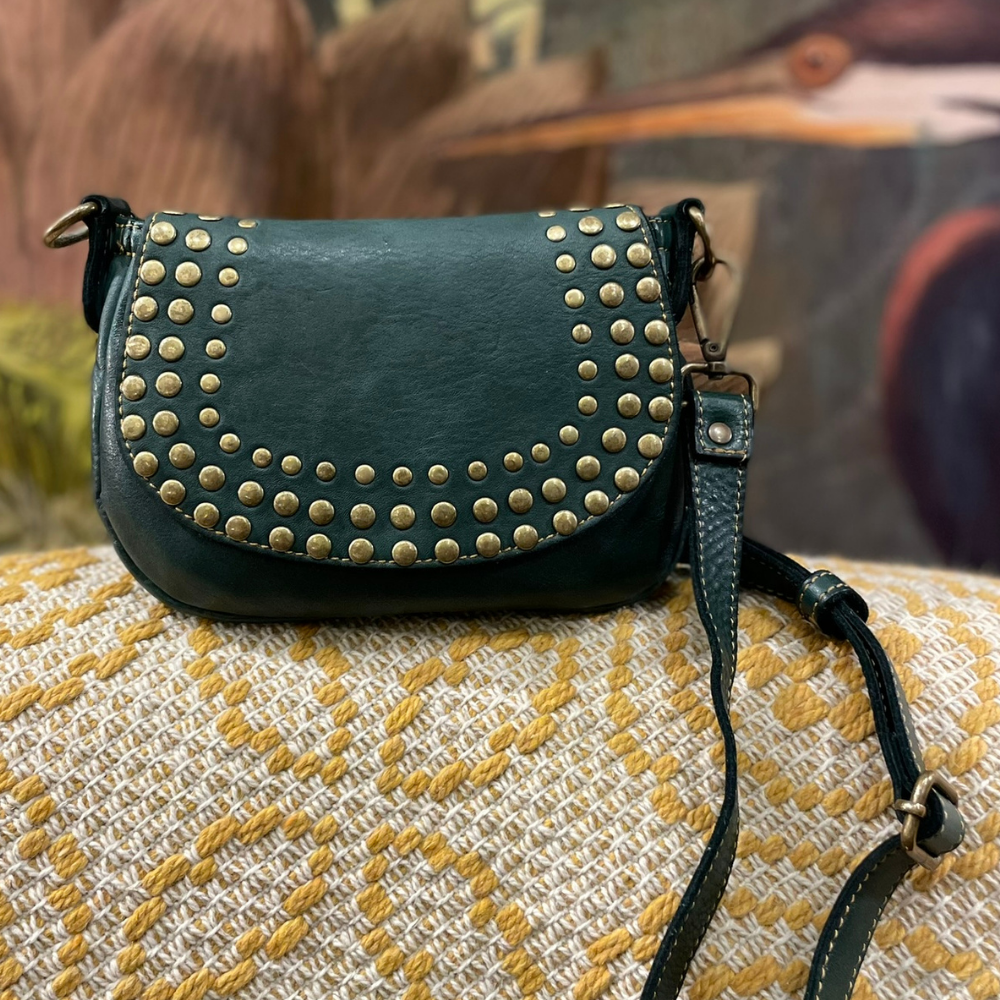 Il design è valorizzato dalle borchie applicate lungo il profilo della patta, dettaglio distintivo che aggiunge personalità e richiama l’estetica vintage tipica del brand Bayside. Il colore verde foresta, profondo e ricercato, richiama tonalità naturali e rende questa borsa una scelta originale e sofisticata.