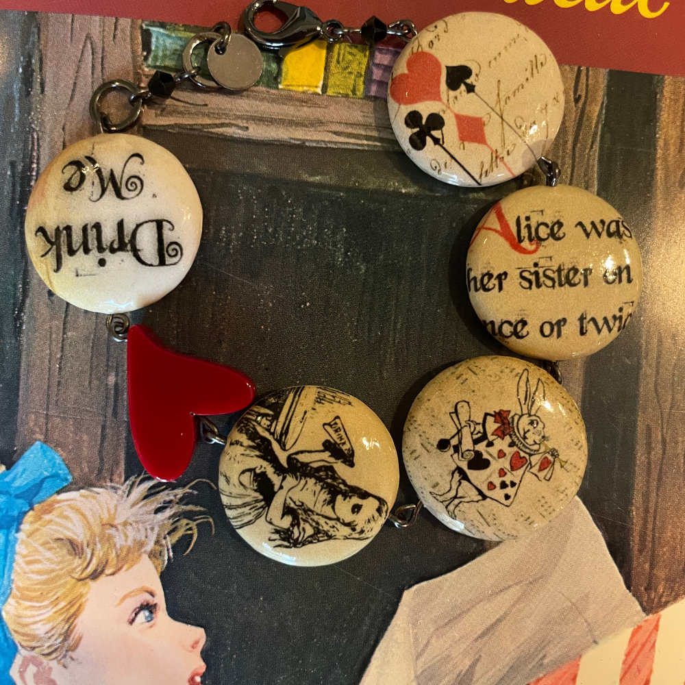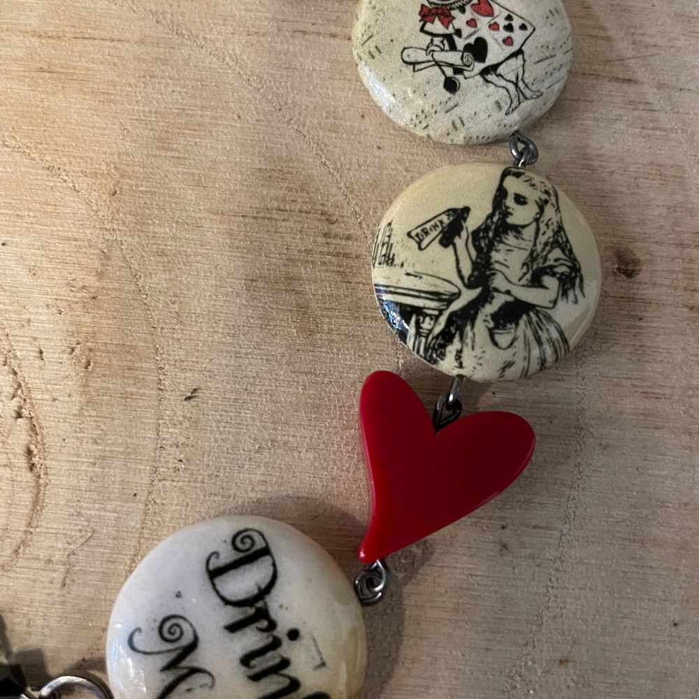 Entra nella magia di Alice nel Paese delle Meraviglie con questo braccialetto artigianale firmato Anna Lodi, un piccolo scrigno di fantasia da indossare ogni giorno. La base in legno naturale è rivestita da immagini illustrate che raccontano alcuni dei simboli più iconici della fiaba: i quattro segni delle carte, l’immancabile Bianconiglio, la sognante Alice e la celeberrima scritta “Drink Me”, perfetta per chi ha un cuore curioso e un’anima un po’ ribelle.