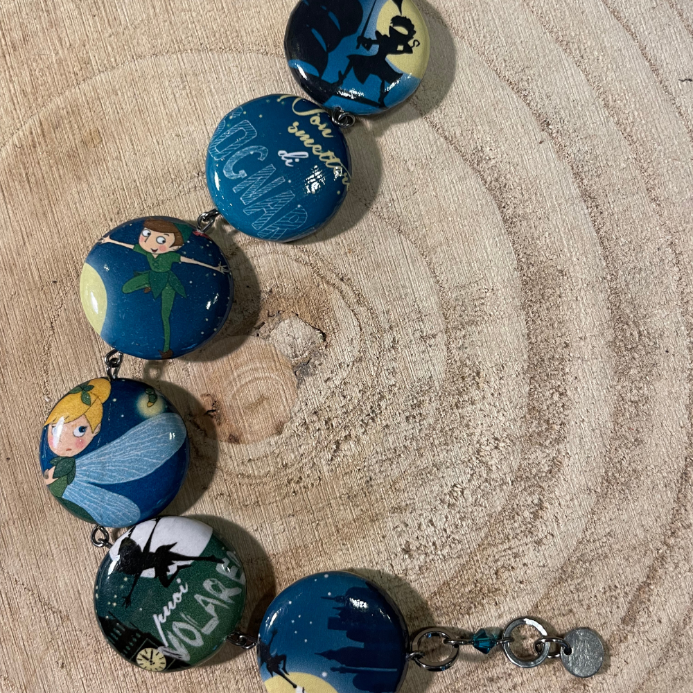 Il braccialetto Anna Lodi – Peter Pan Edition è un piccolo concentrato di magia, nostalgia e fantasia. Realizzato interamente a mano, presenta una base in legno naturale rivestita da immagini ispirate ai momenti più iconici della fiaba di Peter Pan.