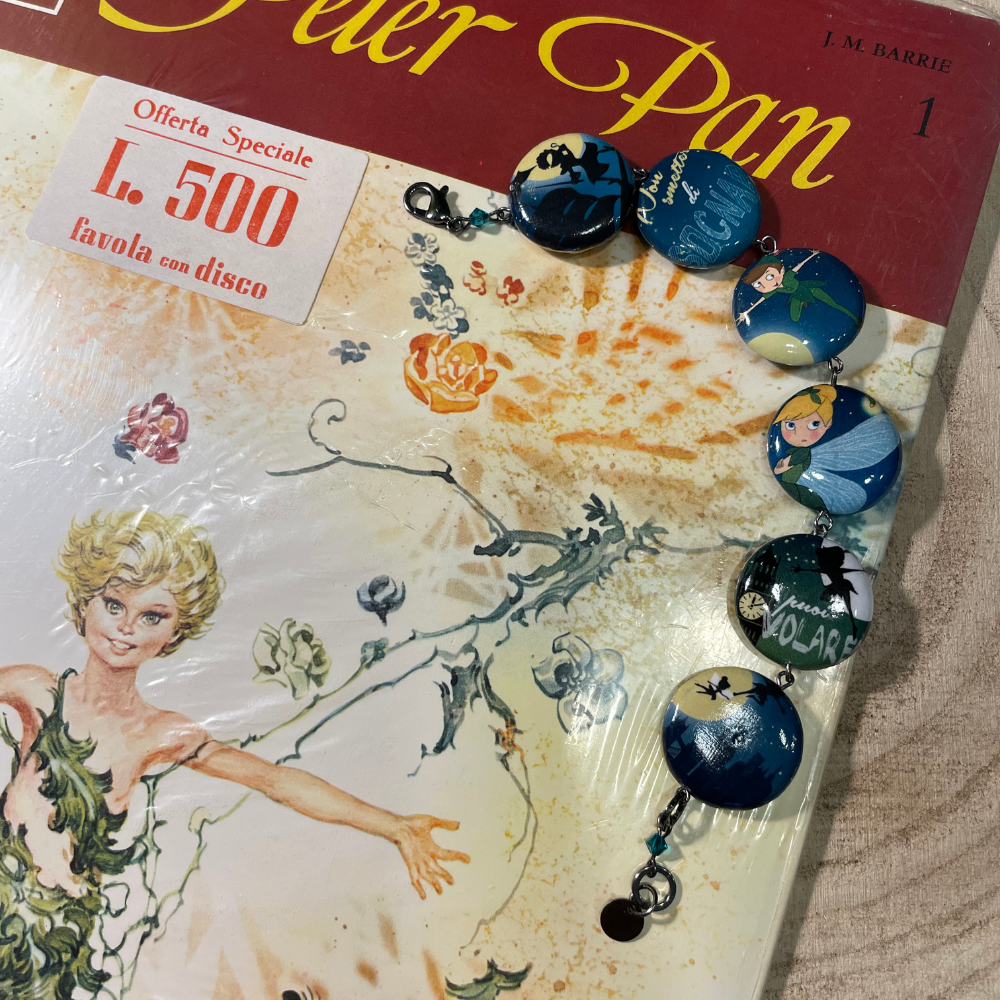 Sul bracciale trovi Capitan Uncino, pronto a complottare come sempre, la luminosa Trilly che spruzza polvere di fata, e lo stesso Peter Pan, simbolo eterno della libertà e del rimanere bambini dentro. Non mancano le frasi motivazionali che hanno fatto sognare generazioni: “Non smettere di sognare” e “Puoi volare”, perfette per chi ama portare un messaggio positivo sempre con sé.