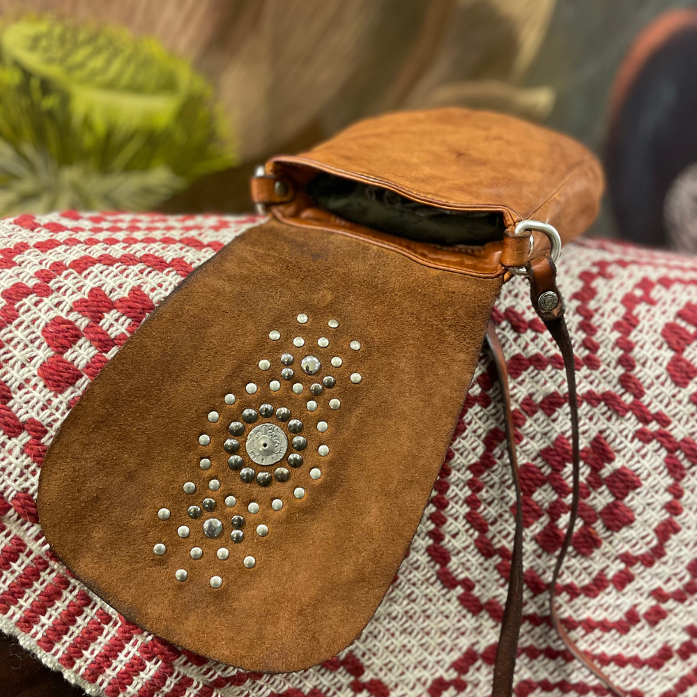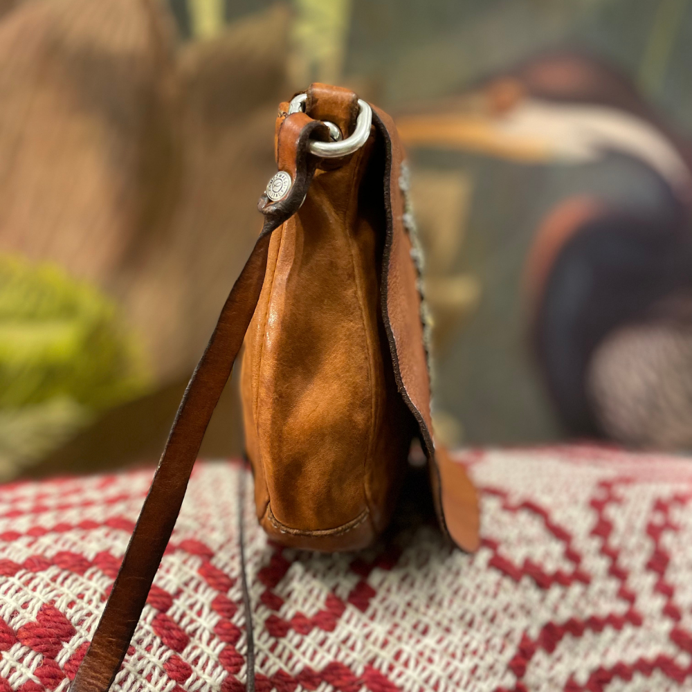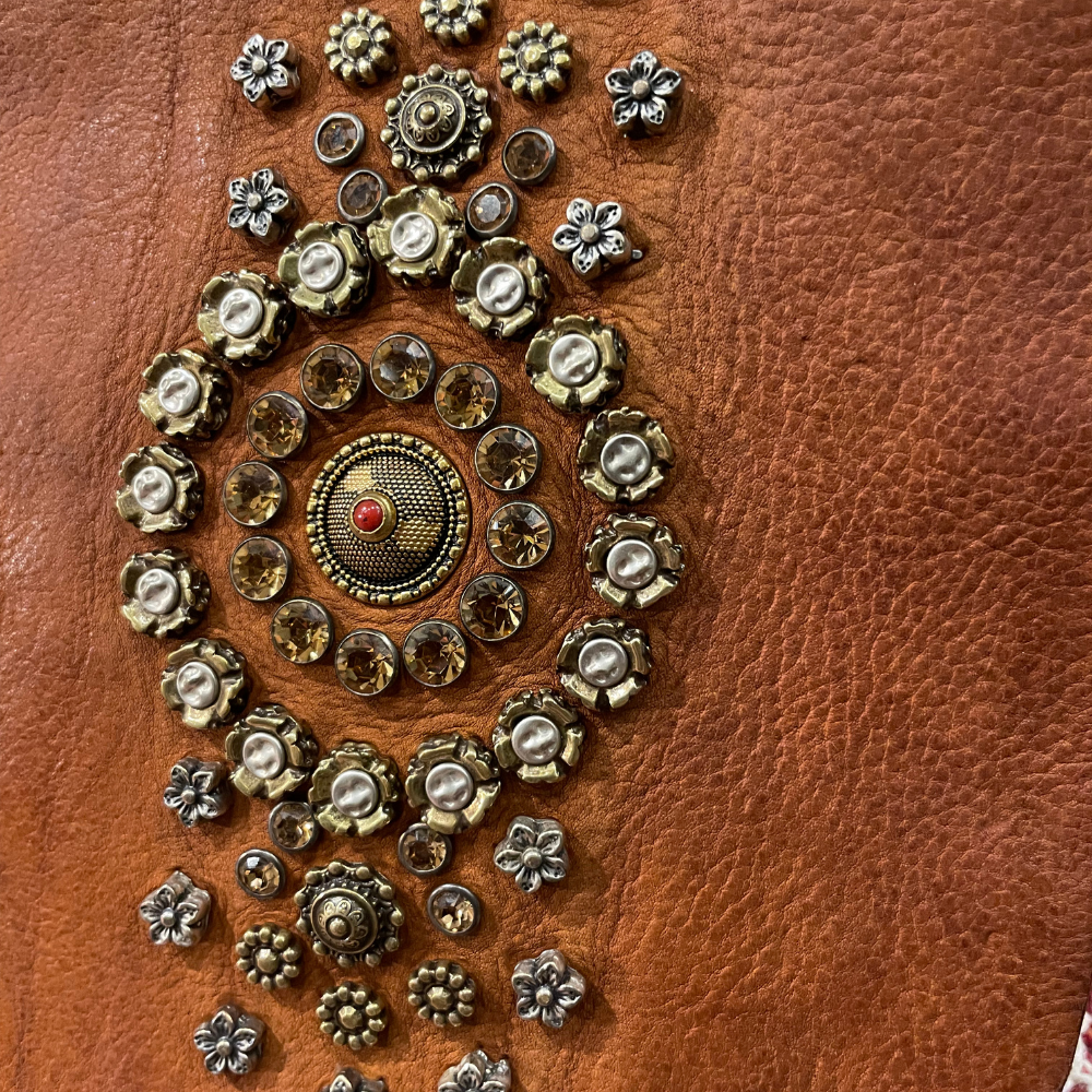 La lavorazione tinta in capo conferisce alla pelle una profondità cromatica unica, con sfumature naturali che rendono ogni borsa diversa dall’altra. Il colore cognac esalta la texture della vacchetta e valorizza i dettagli luminosi degli strass, creando un perfetto equilibrio tra spirito vintage e ricercatezza contemporanea.