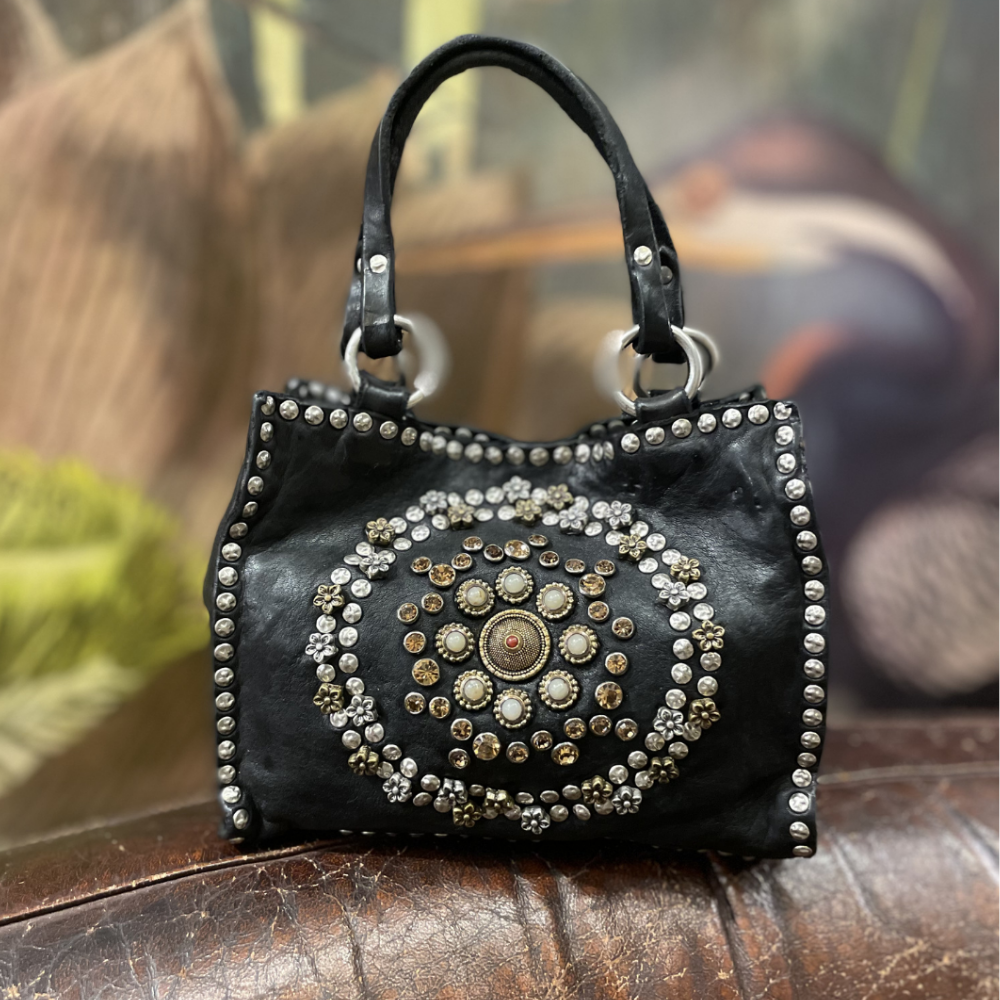 Il colore nero esalta il carattere sofisticato del modello, mentre i rivetti a fiore arricchiti da delicati strass nella parte centrale donano luce e personalità, trasformando questa tracollina in un accessorio distintivo ma sempre versatile. Le dimensioni compatte la rendono ideale per accompagnare sia look quotidiani sia outfit più eleganti, mantenendo un perfetto equilibrio tra praticità e stile.
