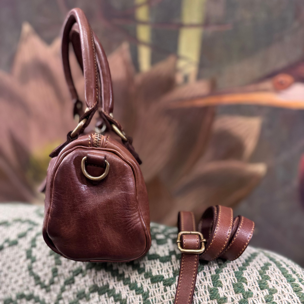 Il mini bauletto Bayside BS763 in colore cognac è una borsa in pelle di vitello che esprime al massimo il carattere caldo e materico della lavorazione artigianale.Realizzato in pelle di vitello lavata e tinta in capo, questo modello acquisisce una particolare morbidezza e un aspetto naturalmente vissuto, con leggere variazioni cromatiche che rendono ogni borsa unica.