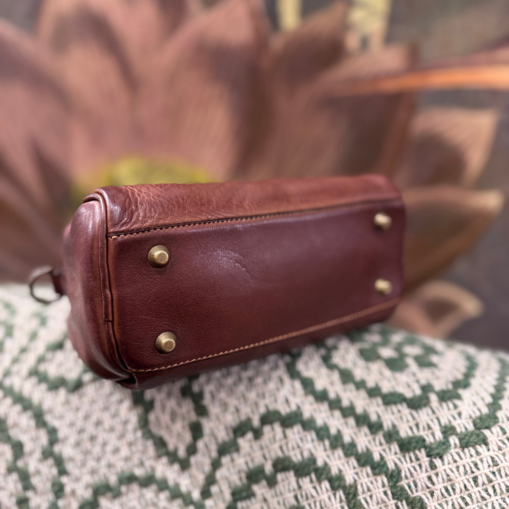 Il colore cognac esalta la qualità del vitello lavato e la lavorazione vintage, conferendo alla borsa un’eleganza discreta ma ricca di personalità.