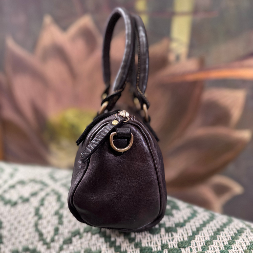 Il mini bauletto Bayside BS763 in colore testa di moro è una borsa in pelle artigianale che esprime eleganza senza tempo e grande versatilità. Realizzato in pelle di vitello lavata e tinta in capo, presenta una lavorazione vintage Made in Italy che rende ogni pezzo unico, con leggere sfumature e una texture naturalmente vissuta.