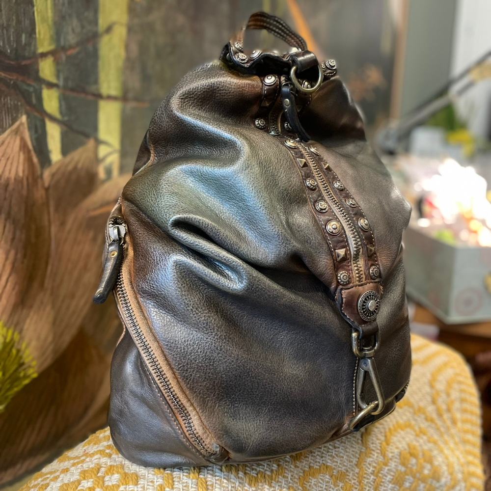 Il colore petrolio, intenso e ricercato, esalta le sfumature della pelle spazzolata e rende questo zaino immediatamente riconoscibile, perfetto per chi cerca un’alternativa originale ai classici zaini in pelle.